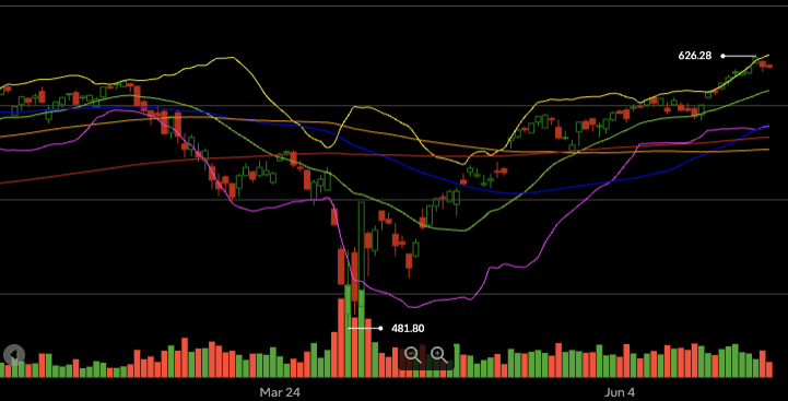 SPY is currently trading near the upper band of its Bollinger Bands, a level that often signals overbought conditions and reduced upside potential. Historically, price touching or exceeding the upper band often leads to a short-term pullback.